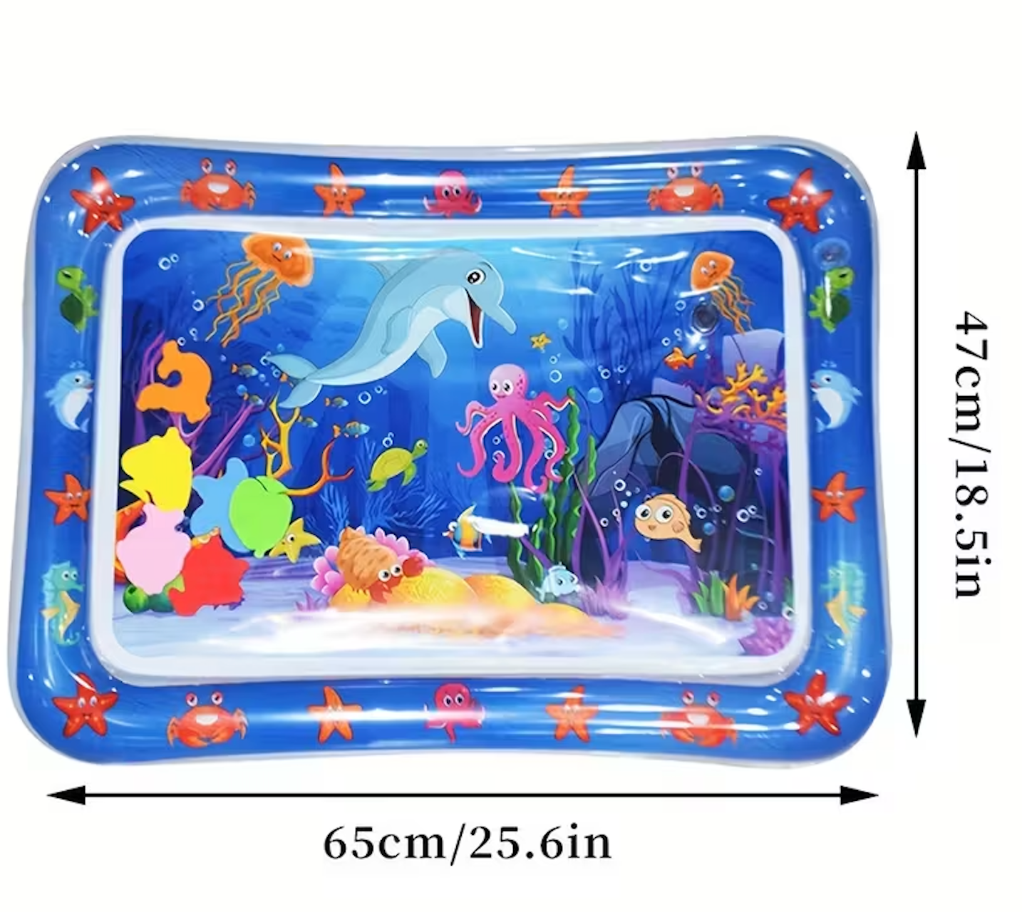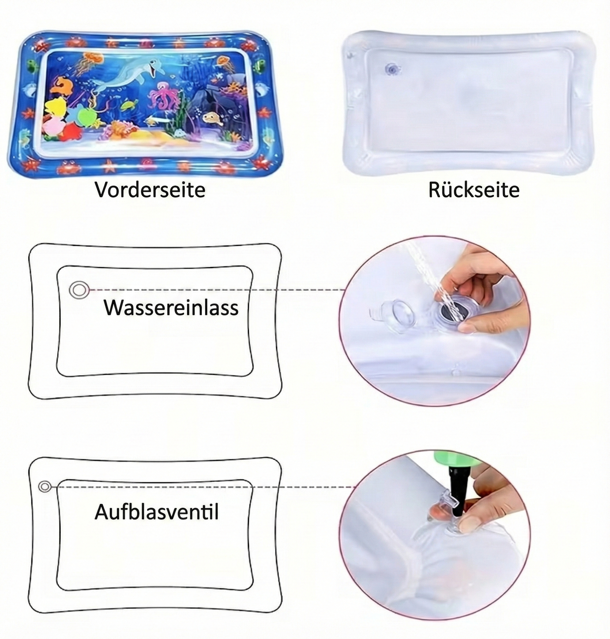 Bunte Unterwasser-Motive und bewegliche Elemente wecken die Neugier deines Babys und stärken gleichzeitig Nacken-, Rücken- und Armmuskulatur. Die Matte ist weich, auslaufsicher und schnell einsatzbereit – einfach mit Wasser befüllen und losspielen.